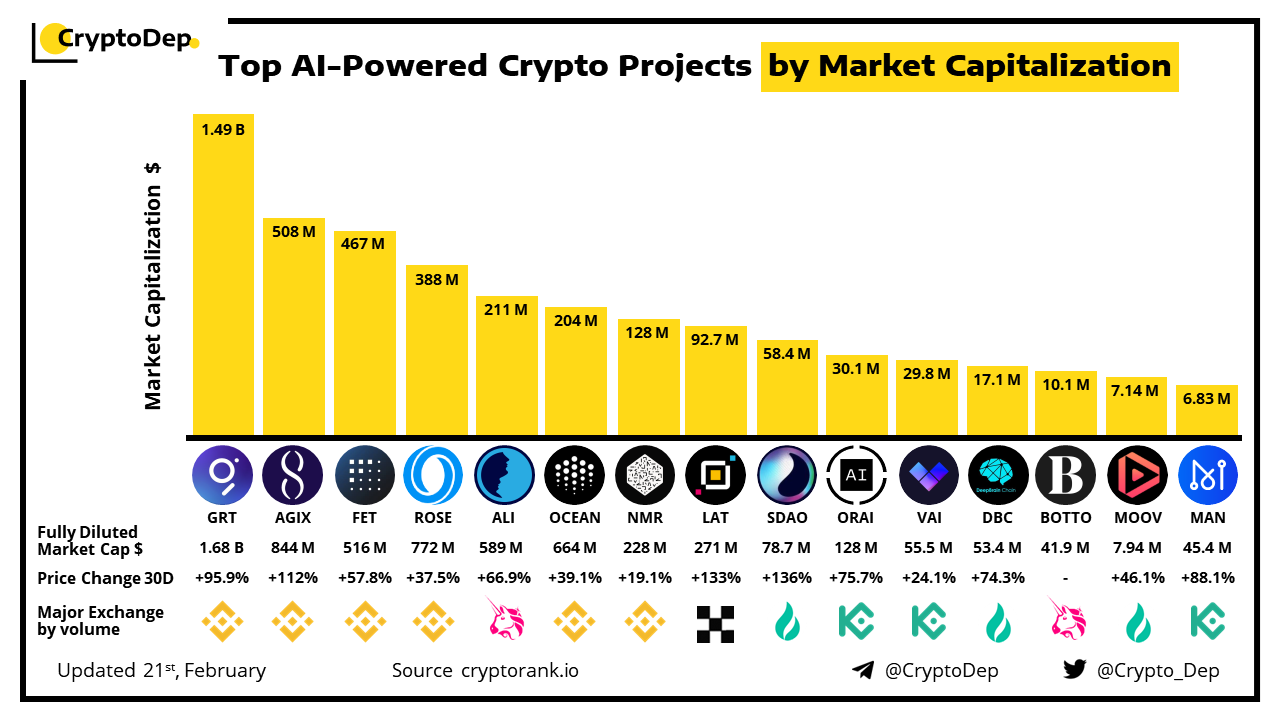 With the rapid growth in popularity and adoption of AI technologies, its implementation has spread into the cryptocurrency industry as well. Let's take a dive into the current state of the emerged market and examine the biggest AI-powered crypto projects.