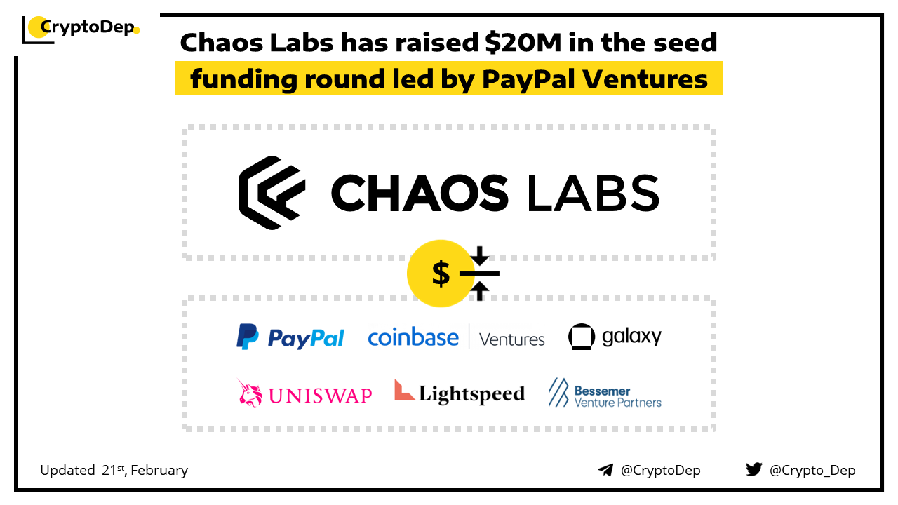 Chaos Labs, a blockchain risk analytics firm, has announced the closure of the $20M seed investment round led by PayPal Ventures and Galaxy Digital. Additional round participants included Coinbase, Uniswap, Lightspeed, Bessemer, and angel investors like Balaji Srinivasan and Naval Ravikant.
