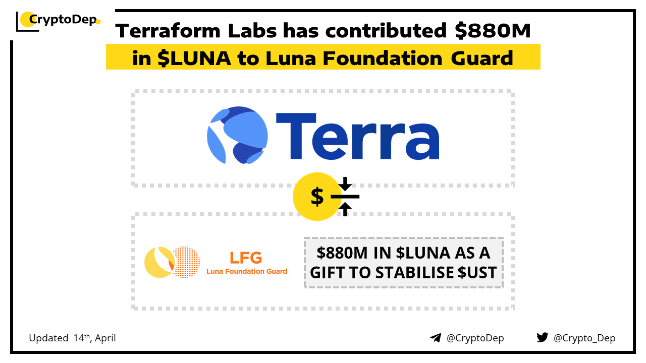Terraform Labs claimed that it has gifted $880M in $LUNA to Luna Foundation Guard. The funds will be used toward the foundationβs goal of acquiring additional collateral to help boost the stability of the UST stablecoin. This is not the first time Terraform Labs has given a large sum of LUNA to the foundation. In March 2022, Terraform Labs sent $1.1B in LUNA tokens to the foundation.