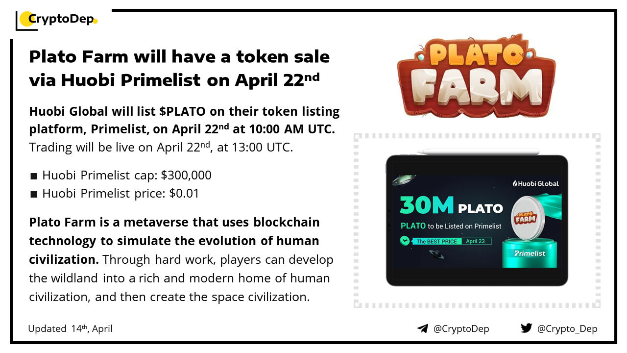 Trading for PLATO/USDT trading pair will be live on Huobi, on April 22nd, at 13:00 UTC. Plato Farm is a metaverse that uses blockchain technology to simulate the evolution of human civilization.