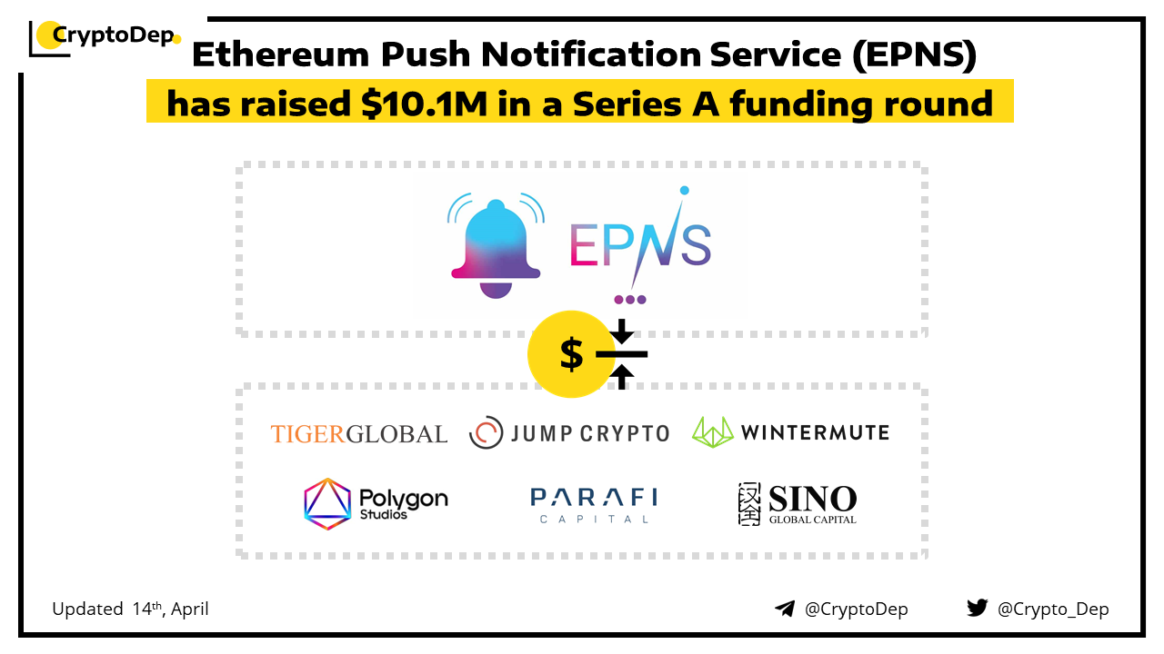 Ethereum Push Notification Service has closed its $10.1M Series A funding round at $131M valuation. Jump Crypto led the funding round with participation from Tiger Global, ParaFi, Polygon Studios, Wintermute, Sino Global Capital, Harmony Foundation, and Zebpay, among others. EPNS will use the funding to expand its team and develop on blockchains beyond Ethereum.