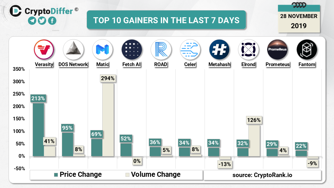 Often we can observe mini alt-season when BTC stabilizes after the price drop. This time, Verasity leads the list of top gainers with striking 213% increase in the price followed by DOS and Matic with an impressive 95% and 69% price increase accordingly.
