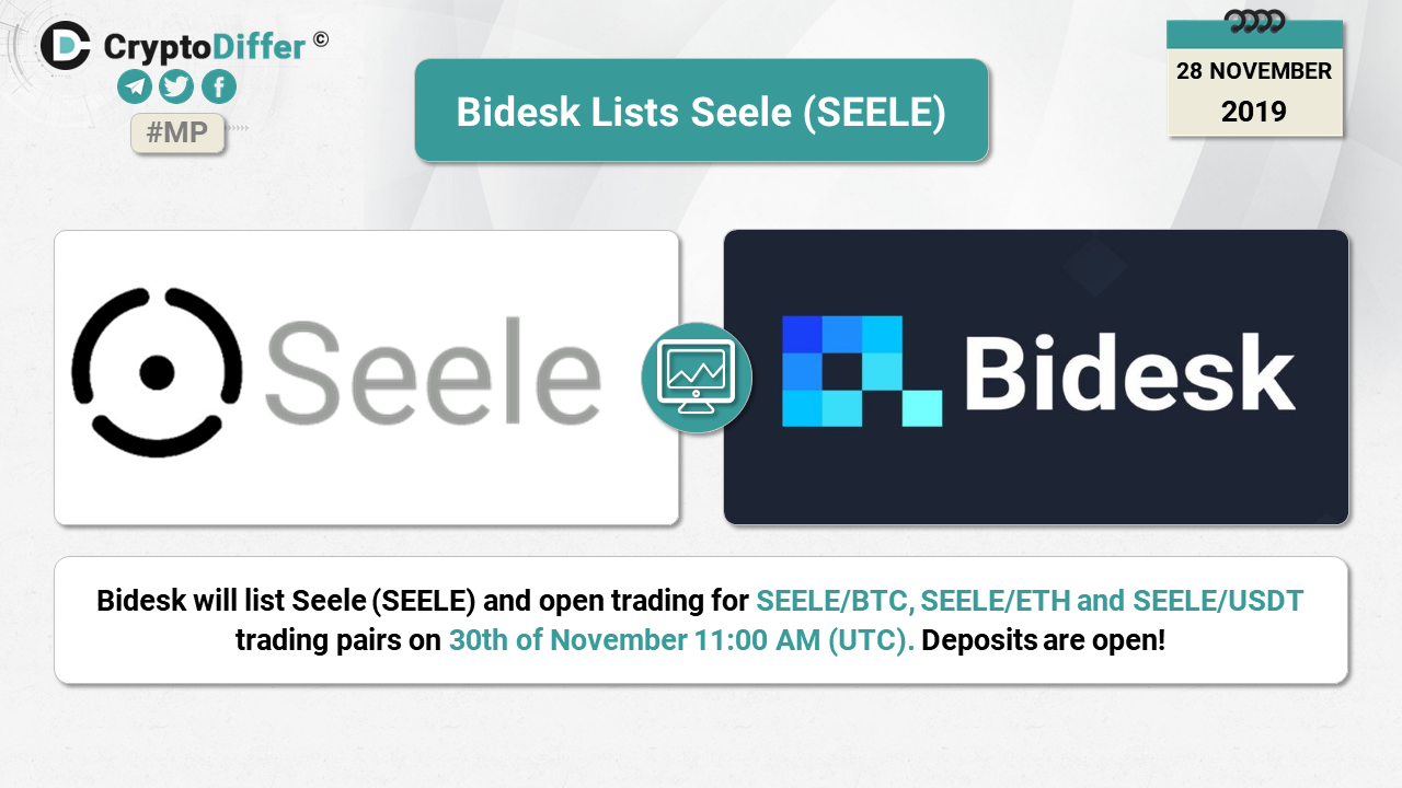 Bidesk will list Seele (SEELE) and open trading for SEELE/BTC, SEELE/ETH and SEELE/USDT trading pairs on 30th of November 11:00 AM (UTC). Deposits are open!