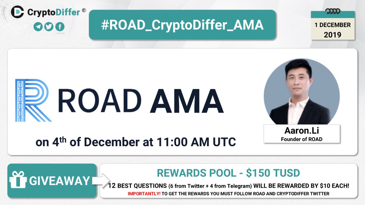 βͺοΈ On the 4th of December AMA starts in the CryptoDiffer Telegram Chat! We will publish selected questions and Aaron Li (Founder of ROAD) will answer them. The community will be able to ask additional questions on the first-come basis during the AMA as well! Questions from previous AMAs are strictly forbidden and people will be disqualified from participating in the reward distribution.