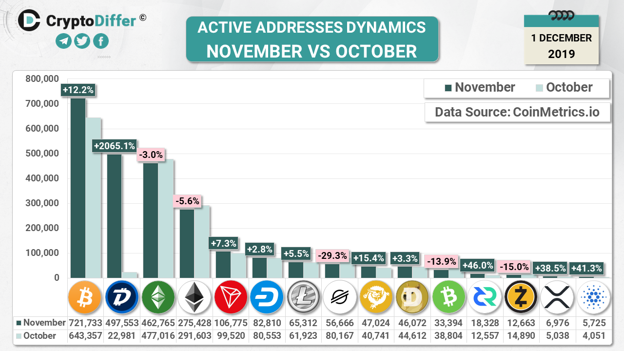 According to the infographic, Bitcoin remains to be the leader. Unexpectedly, Digibyte has taken the second place in the list this month, the number of active addresses has skyrocketed in November by striking 2065%. We also observed the upsurge in the amount of Digibyte daily active addresses back in October, as can be checked in our previous post.
