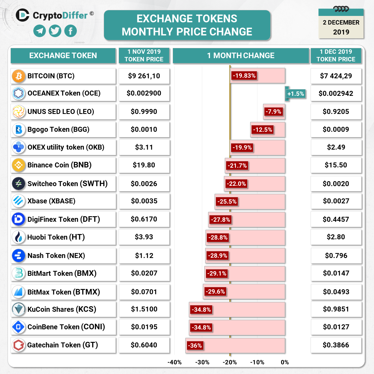 The whole market capitalization has dropped by 20% triggered by BTC price drop in the middle of November. Almost all the exchange tokens prices were negatively affected. The only exchange token that has had positive price performance during the analyzed period is OCE. Some tokens such as LEO, BGG, OKB, BNB, SWTH, and XBASE have lost 20% to 25% the same as BTC, but most of the exchange tokens have experienced a much bigger decline in the price.
