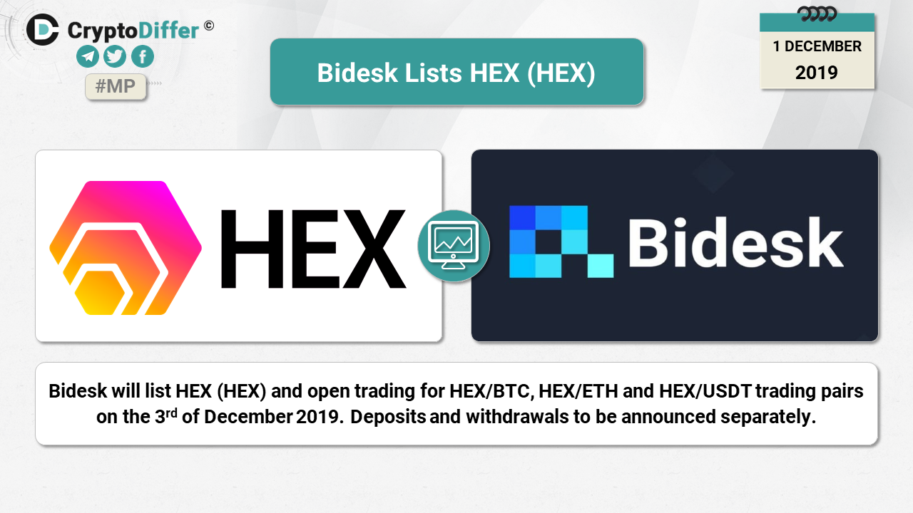 โ Bidesk Lists HEX (HEX) and open trading for HEX/BTC, HEX/ETH and HEX/USDT trading pairs on the 3rd of December 2019