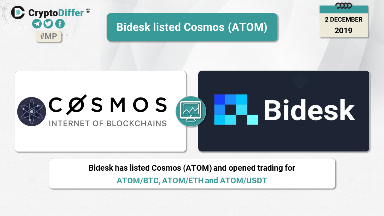 โโBidesk has listed Cosmos (ATOM) and opened trading for ATOM/BTC, ATOM/ETH and ATOM/USDT!