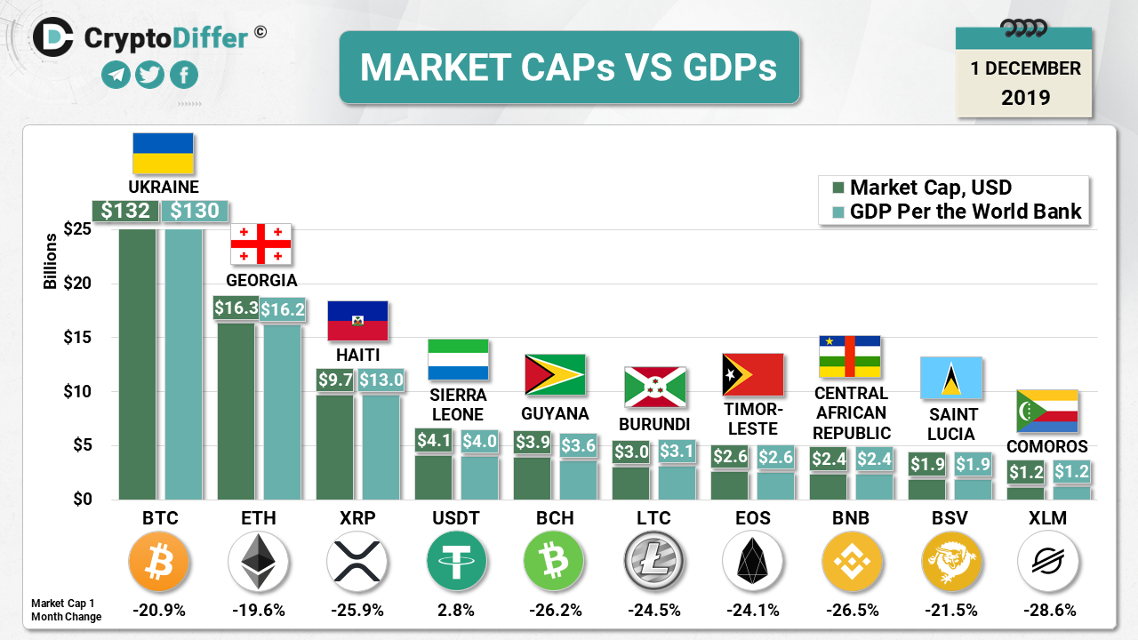 The presented infographic is the comparison of the current market caps VS GDPs.
