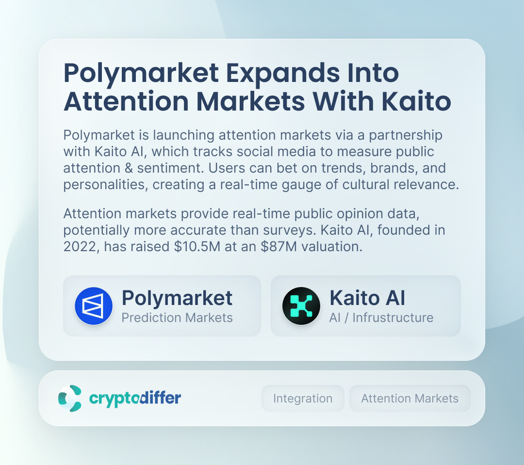 Polymarket is launching attention markets via a partnership with Kaito AI, which tracks social media to measure public attention and sentiment. Users can bet on trends, brands, and personalities, creating a real-time gauge of cultural relevance.