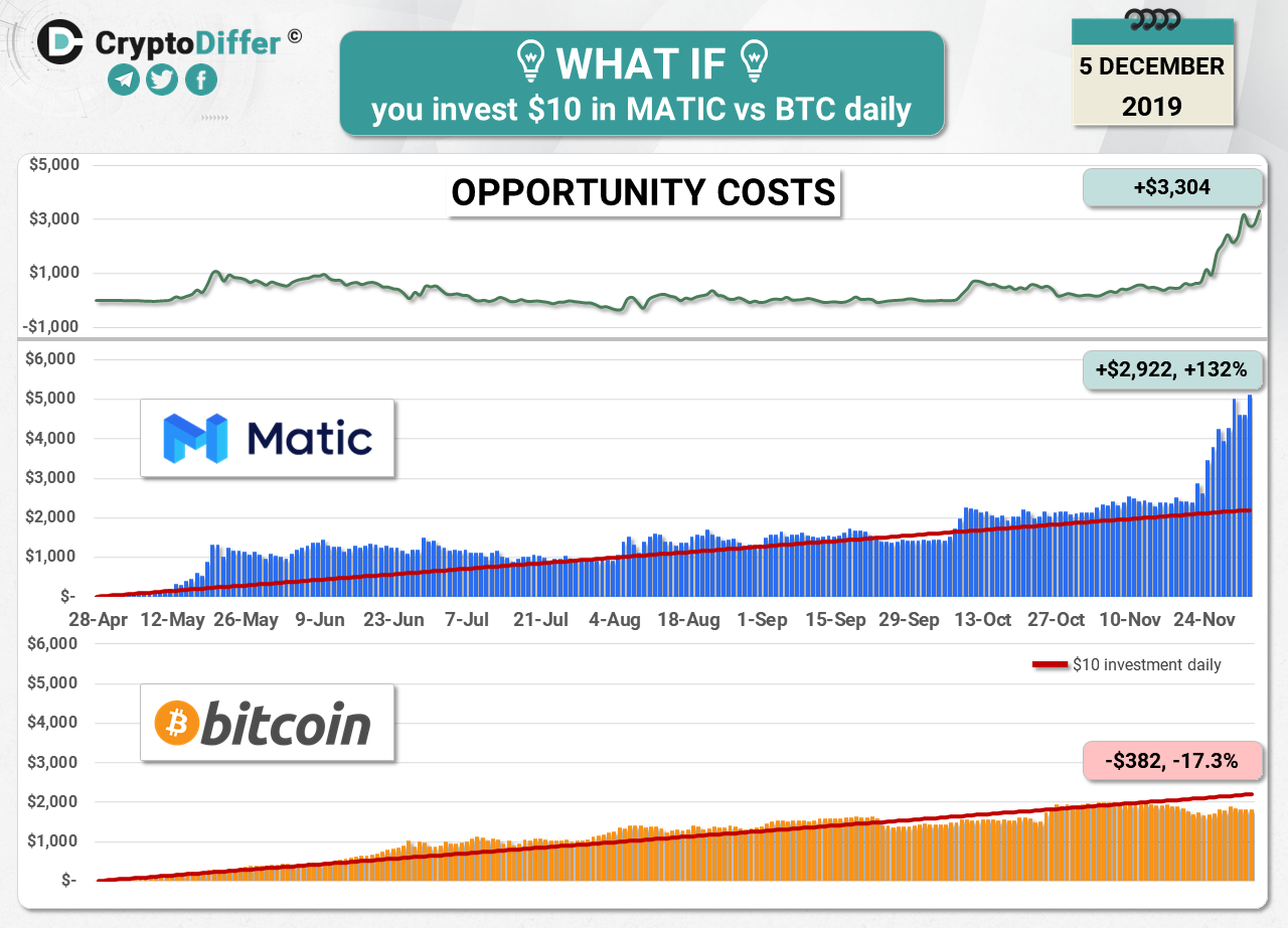 In this graph, we showcase what could have happened with your investment if you have been investing in Matic 10$ everyday since their listing on Binance on the 26th of April till today (222 days). We provide the chart for BTC 10$ daily investment for the same period as well.