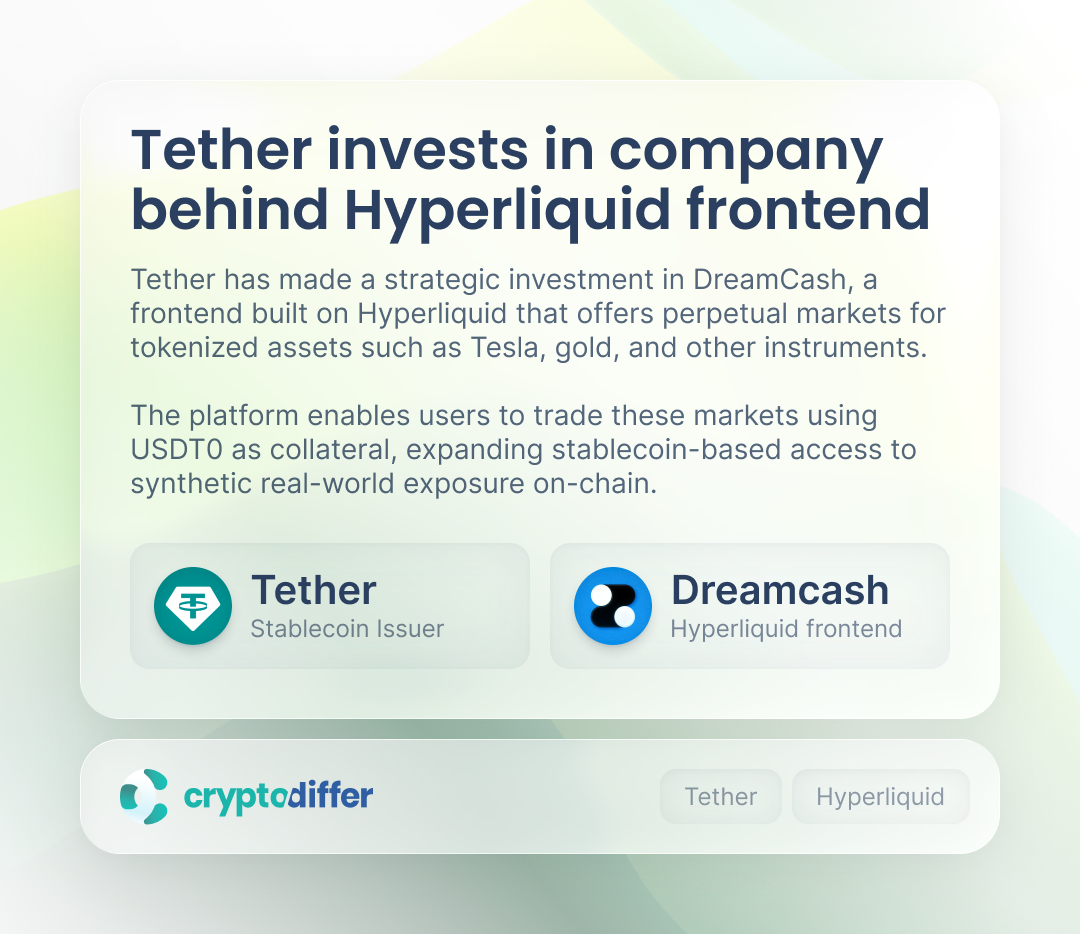 Tether made a strategic investment in DreamCash, a frontend built on Hyperliquid that offers perpetual markets for tokenized assets. The platform enables users to trade these markets using USDT0 as collateral, expanding access to synthetic RWAs exposure on-chain.