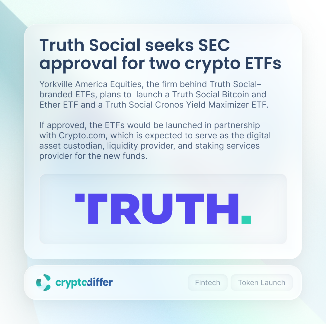 Yorkville America Equities, the firm behind Truth Social–branded ETFs, plans to launch a Truth Social Bitcoin and Ether ETF and a Truth Social Cronos Yield Maximizer ETF. If approved, the ETFs would be launched in partnership with Crypto(.)com.