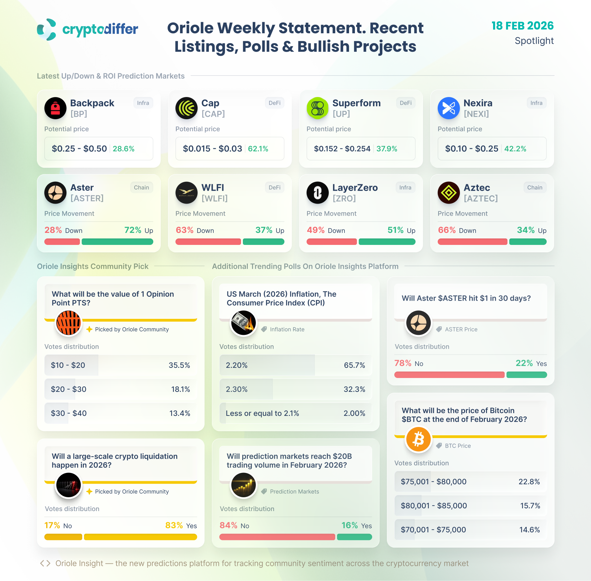 Recent highlights include Backpack, Cap, Superform, and Nexira — with CAP showing the strongest upside projection (+62%).