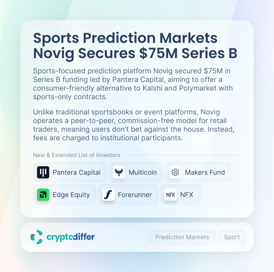 Sports-focused prediction platform Novig secured $75M in Series B funding led by Pantera Capital, aiming to offer a consumer-friendly alternative to Kalshi and Polymarket with sports-only contracts.