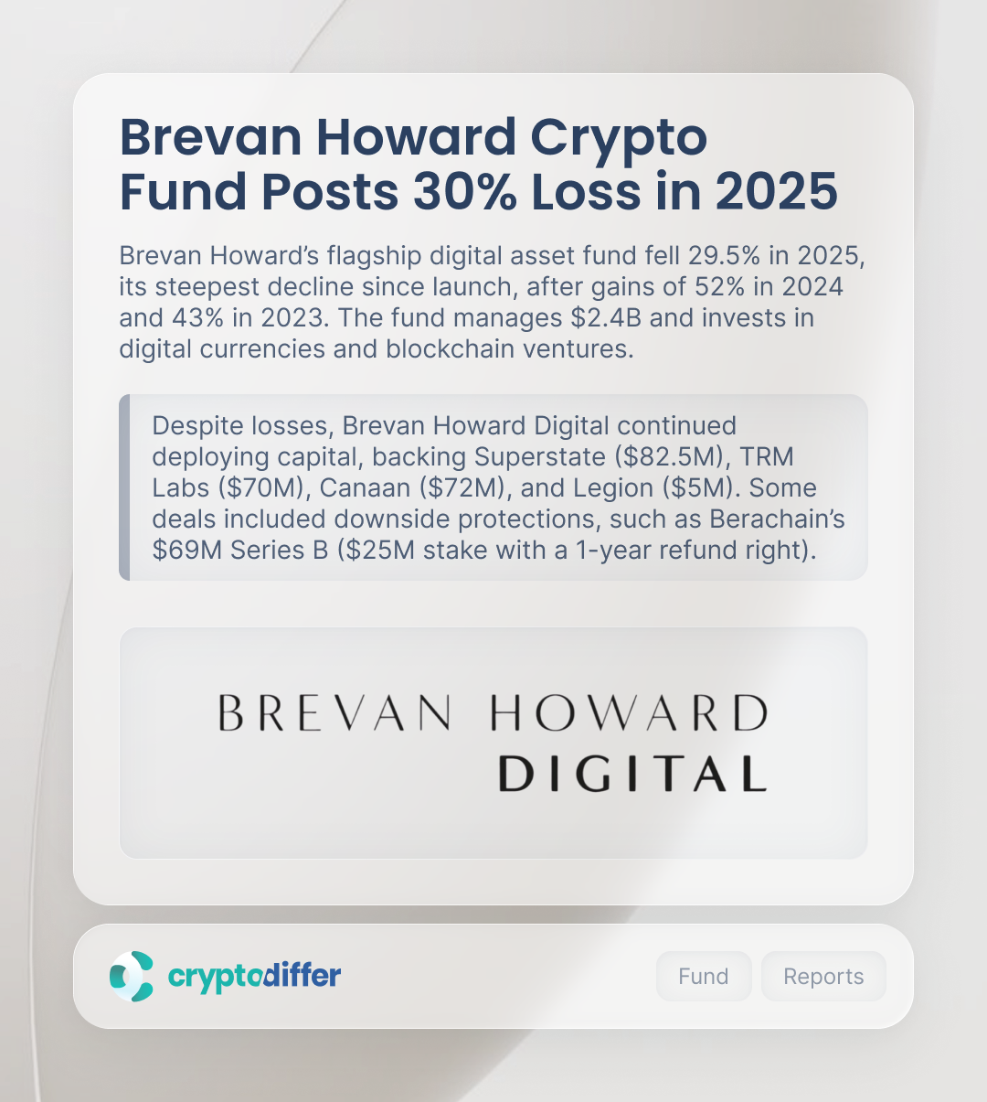 Despite losses, Brevan Howard Digital continued deploying capital, backing Superstate ($82.5M), TRM Labs ($70M), Canaan ($72M), and Legion ($5M). Some deals included downside protections, such as Berachain’s $69M Series B ($25M stake with a one-year refund right).