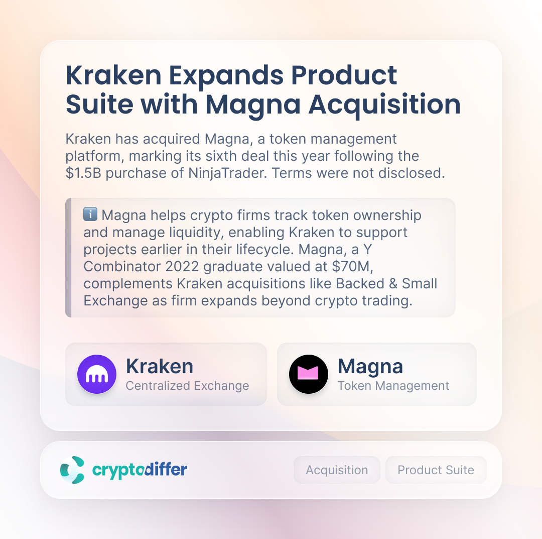 Kraken has acquired Magna, a token management platform, marking its sixth deal this year following the $1.5B purchase of NinjaTrader. Terms were not disclosed.