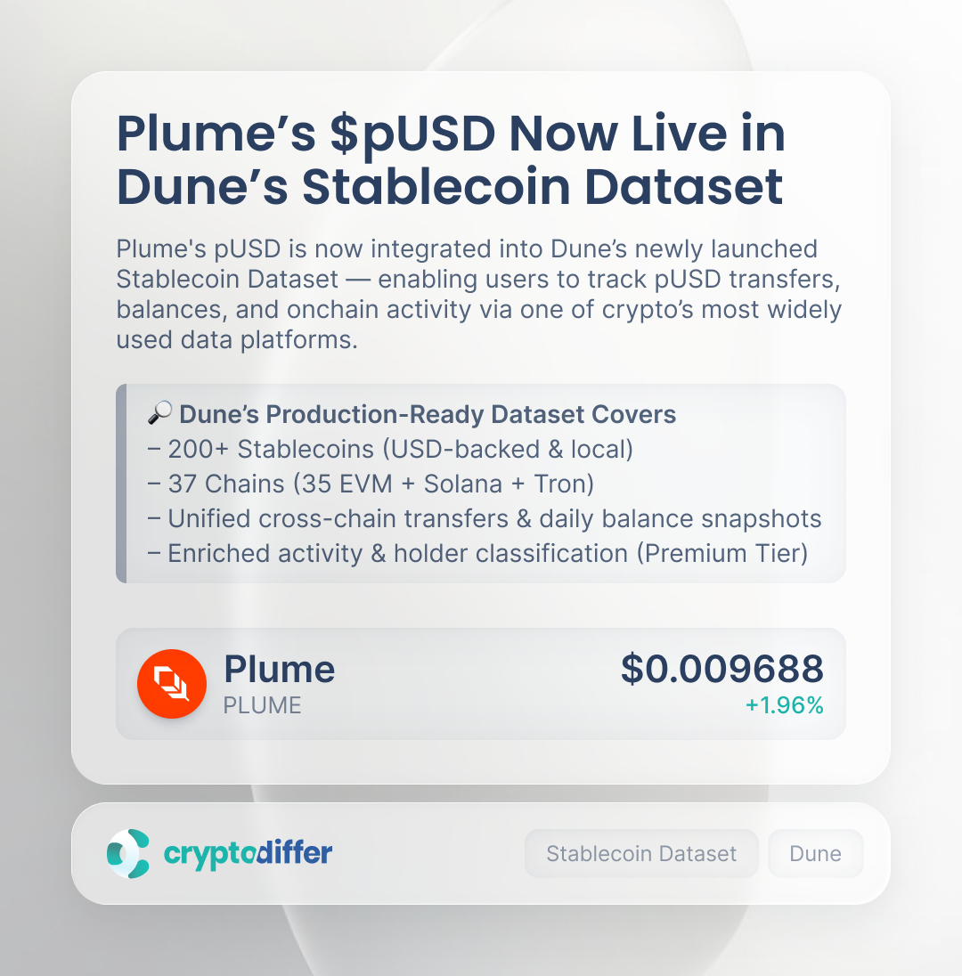 Plume's pUSD is now integrated into Duneβs newly launched Stablecoin Dataset β enabling users to track pUSD transfers, balances, and onchain activity via one of cryptoβs most widely used data platforms.
