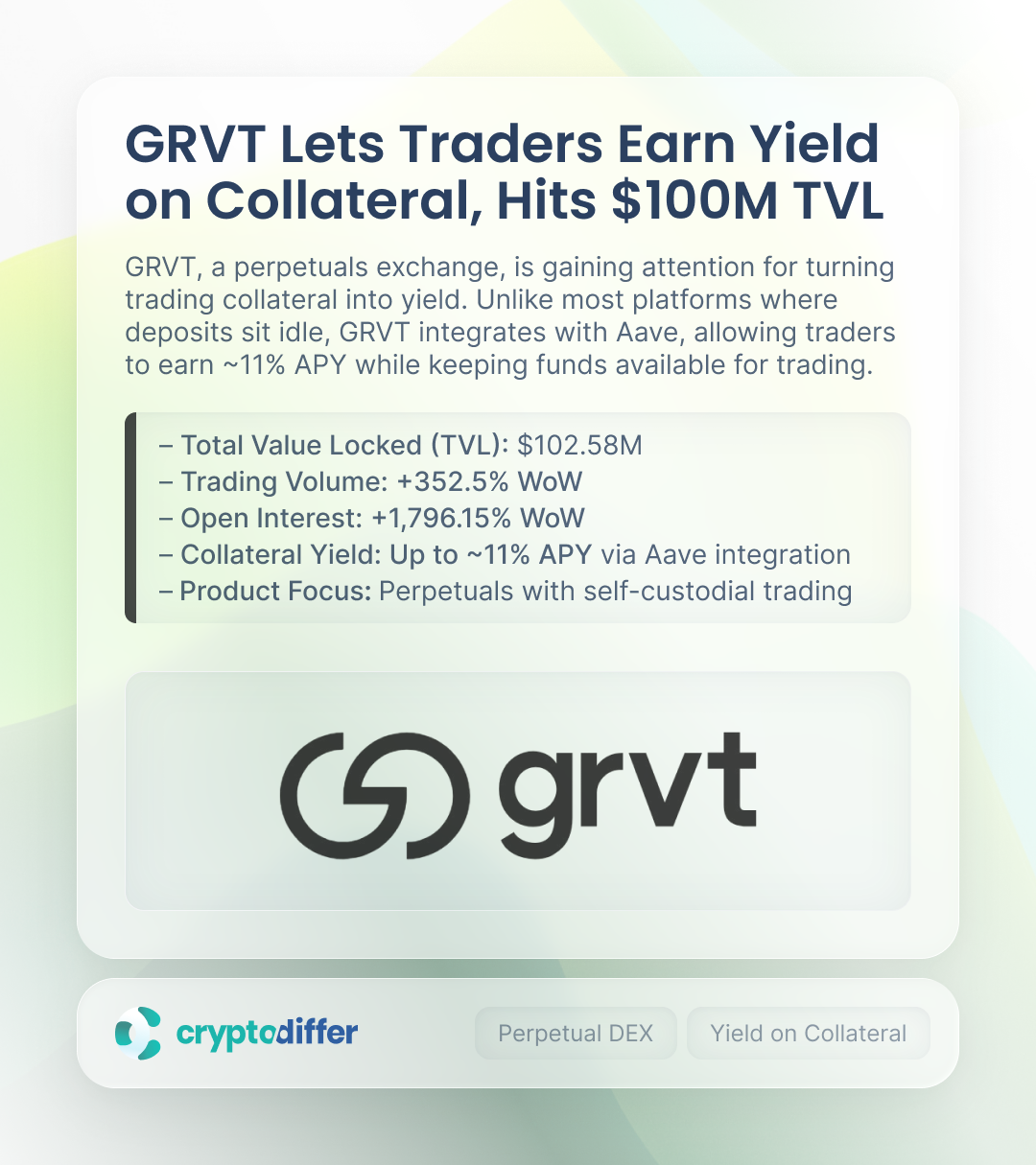 GRVT, a perpetuals exchange, is gaining attention for turning trading collateral into yield. Unlike most platforms where deposits sit idle, GRVT integrates with Aave, allowing traders to earn up to ~11% APY while keeping funds available for trading.