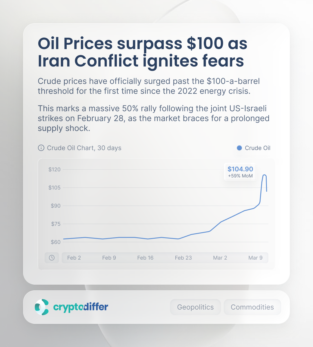 Crude prices have officially surged past the $100-a-barrel threshold for the first time since the 2022 energy crisis. This marks a massive 50% rally following the joint US-Israeli strikes on February 28, as the market braces for a prolonged supply shock.