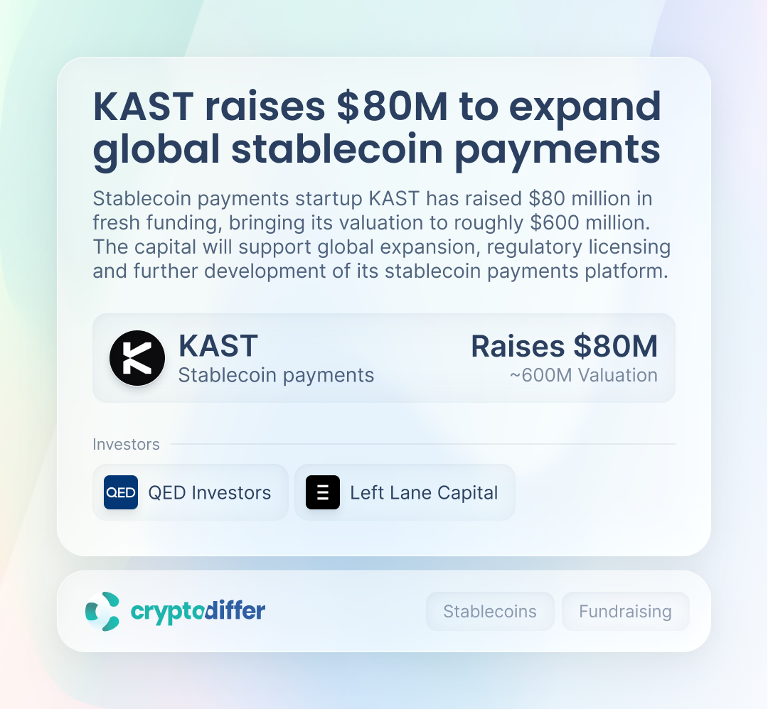Stablecoin payments startup KAST has raised $80 million from QED Investors and Left Lane Capital, bringing its valuation to roughly $600 million. The company is targeting an annual revenue run rate of around $100 million this year.