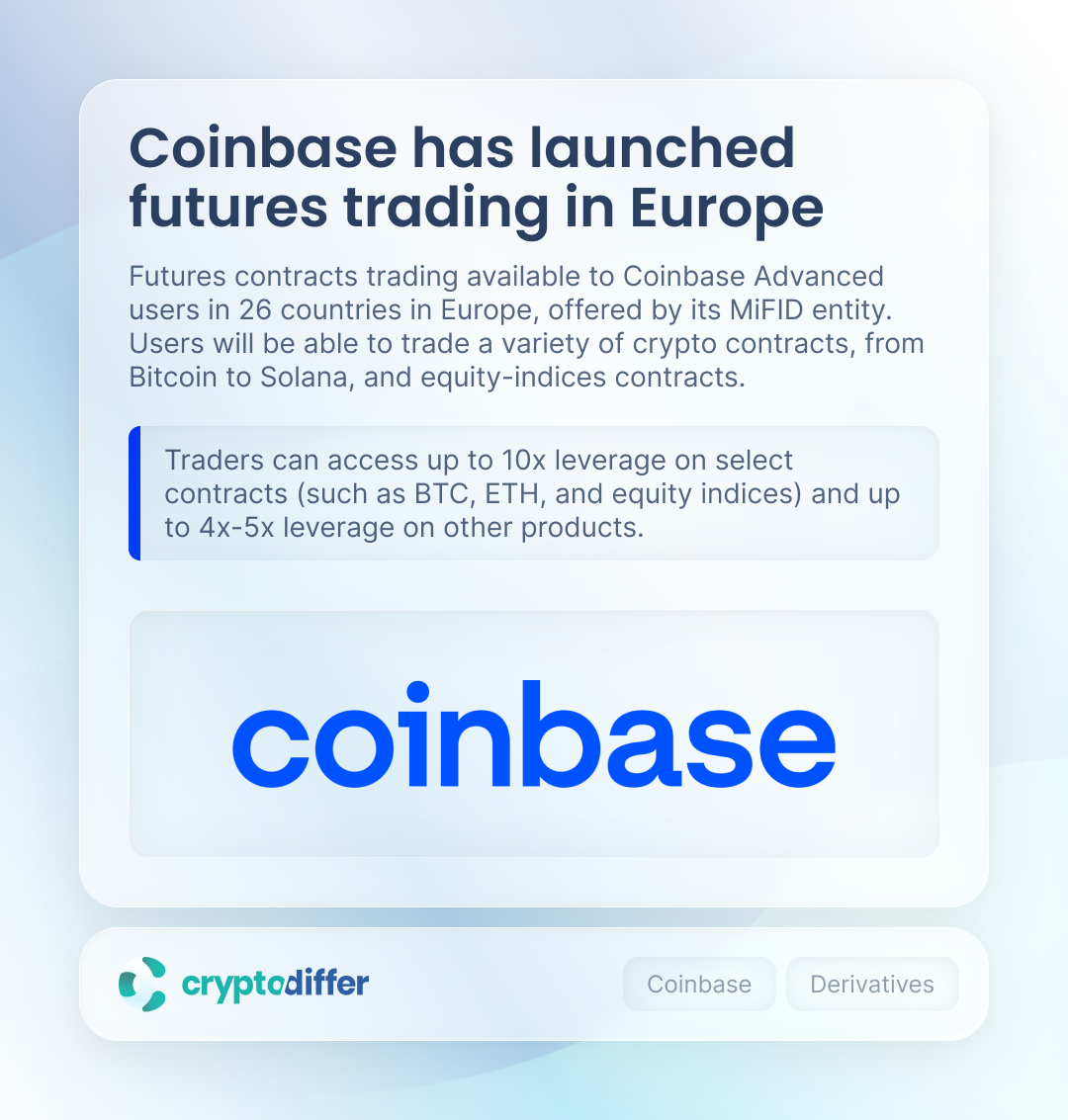 Futures contracts trading is now available to Coinbase Advanced users in 26 countries in Europe, offered by its MiFID entity. Traders can access up to 10x leverage on select contracts (such as BTC, ETH, and equity indices) and up to 4x-5x leverage on other products.