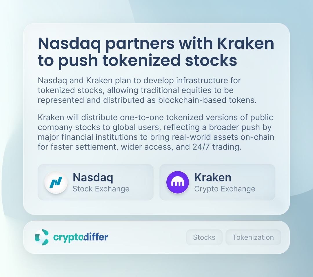 Nasdaq and Kraken are developing infrastructure for tokenized stocks, enabling traditional equities to be issued as blockchain-based tokens and distributed globally through Krakenโs platform.