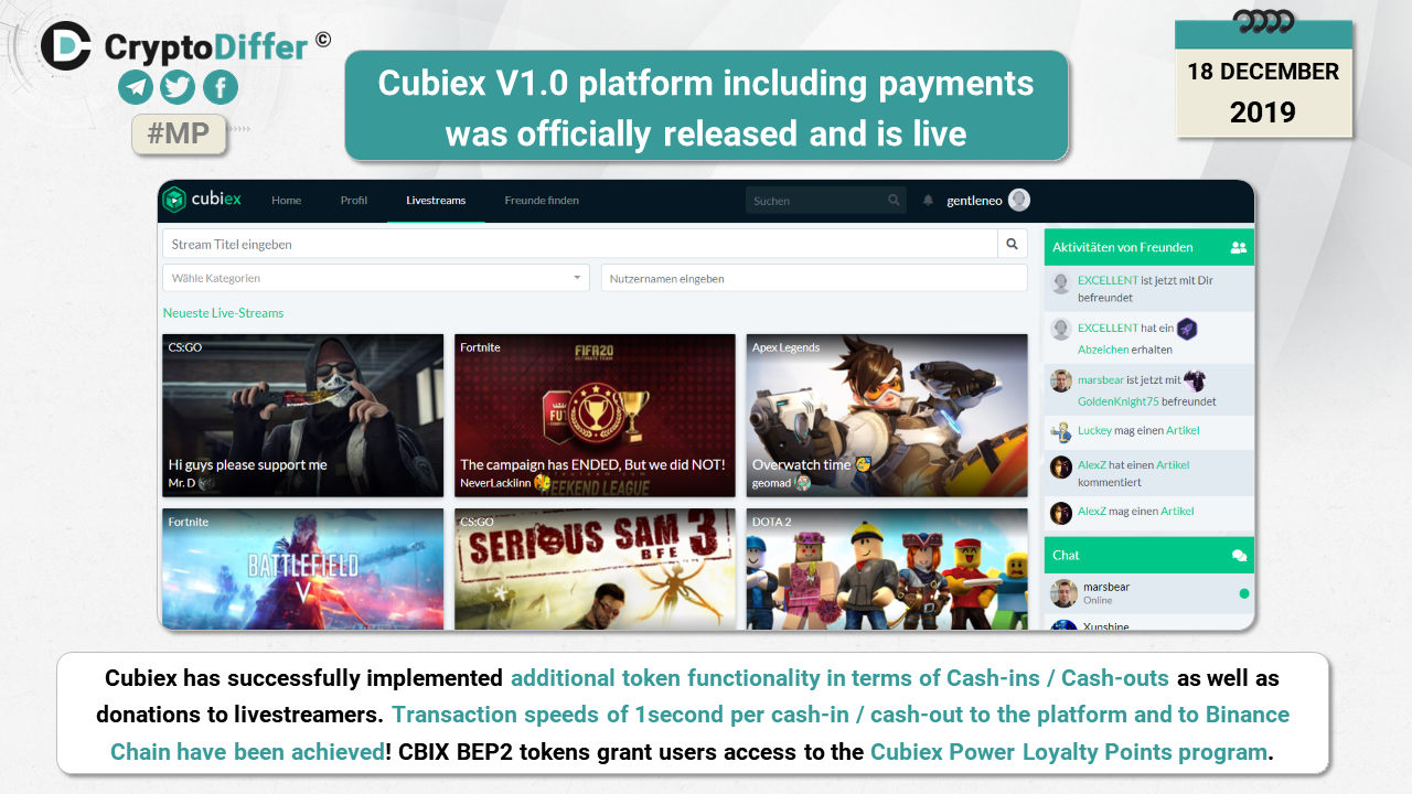 Cubiex has successfully implemented additional token functionality in terms of Cash-ins / Cash-outs as well as donations to livestreamers. Transaction speeds of 1second per cash-in / cash-out to the platform and to Binance Chain have been achieved! CBIX BEP2 tokens grant users access to the Cubiex Power Loyalty Points program.