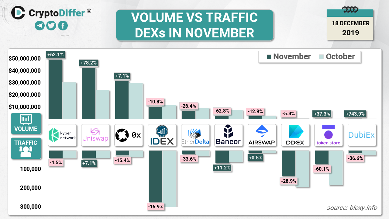 The leaders of trading volume growth are DUBIex, Kyber Network and Uniswap.