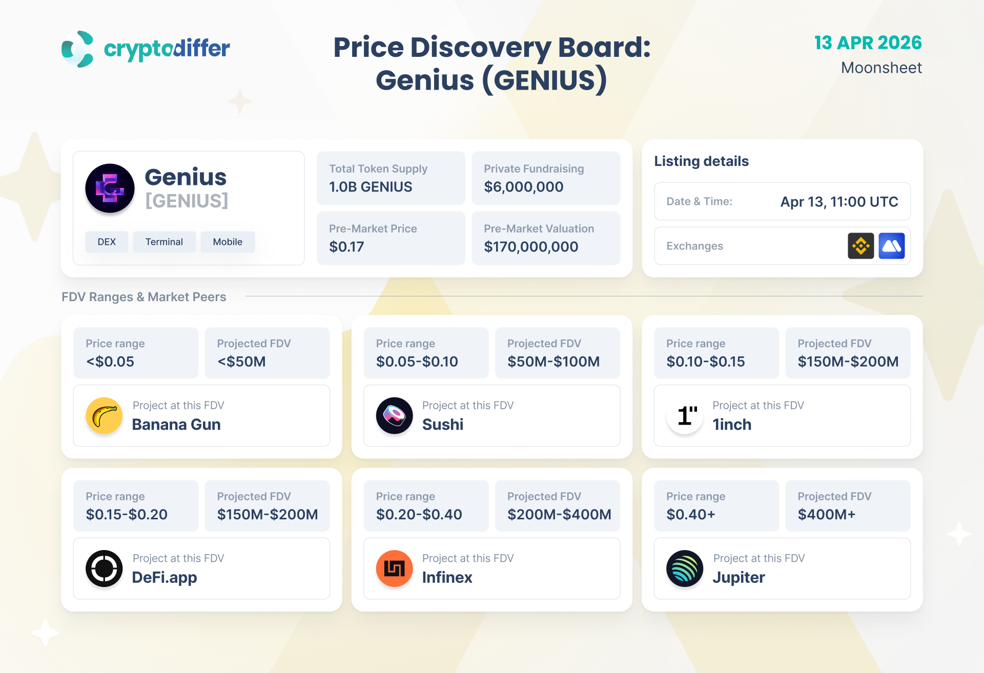 GENIUS trading starts today at 11:00 UTC, backed by $6.0M in private funding. This board compares potential FDV scenarios using benchmarks from other DEXs / Trading Terminals like Banana Gun, Jupiter, 1inch, and Infinex.