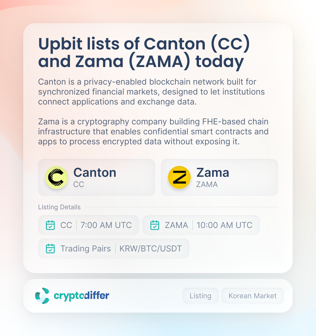 Canton Network (CC) trading has started on Upbit at 7:00 AM UTC, while Zama (ZAMA) trading will commence at 10:00 AM UTC. Both tokens will be available against KRW, BTC, and USDT trading pairs.