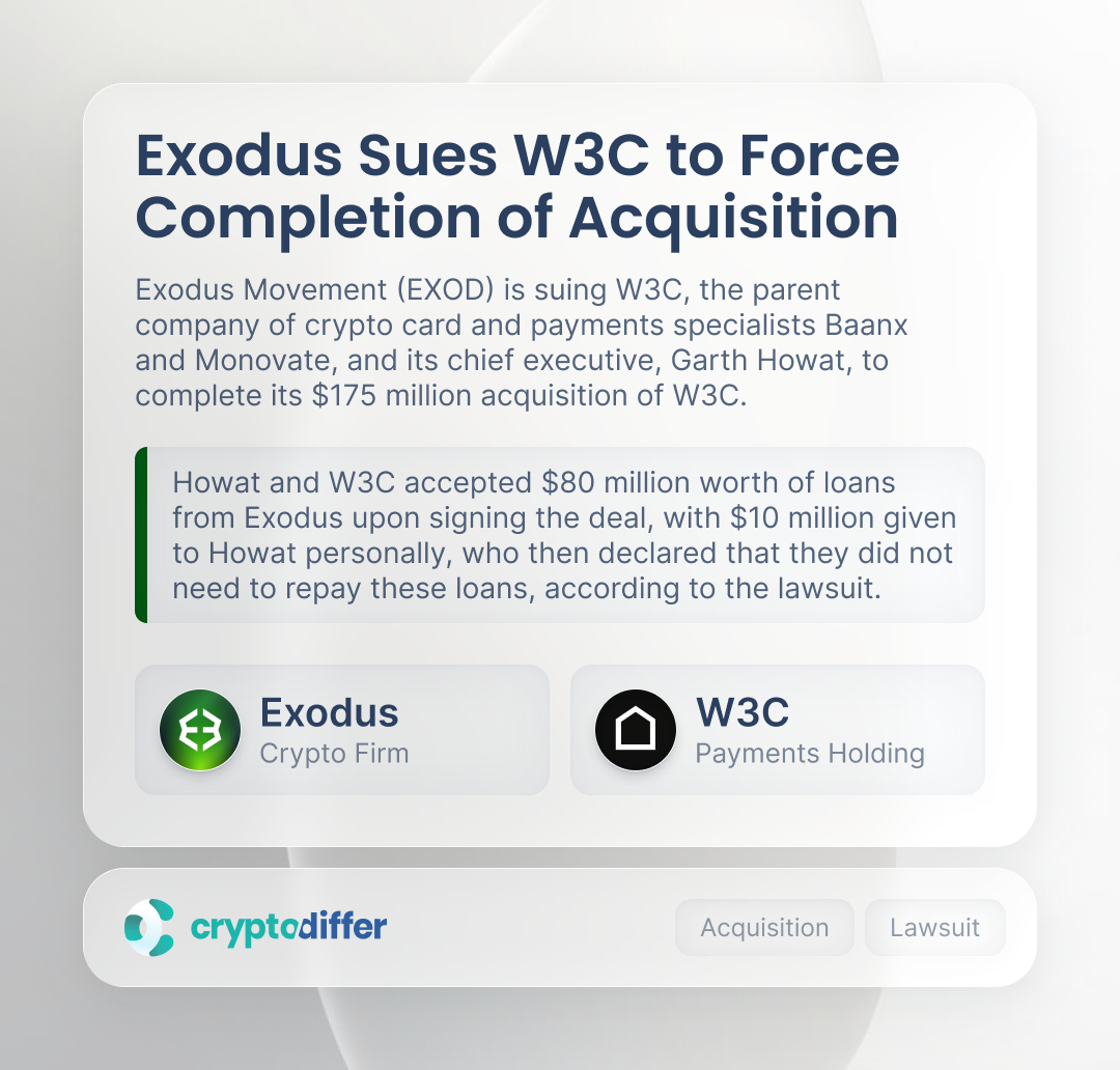 Exodus Movement is suing W3C, the parent company of crypto card and payments specialists Baanx and Monovate, and its CEO, Garth Howat, to complete its $175 million acquisition of W3C.
