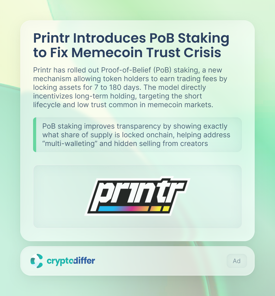 Printr has rolled out Proof-of-Belief (PoB) staking, a new mechanism allowing token holders to earn trading fees by locking assets for 7 to 180 days. The model directly incentivizes long-term holding, targeting the short lifecycle and low trust common in memecoin markets.
