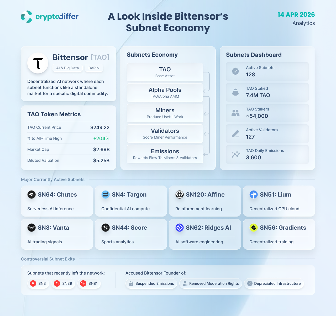 Bittensor’s economy is built around subnets that compete for emissions by producing and validating useful AI-driven work. The map shows how TAO, alpha pools, miners, and validators connect inside a network that now spans 100+ active subnets.