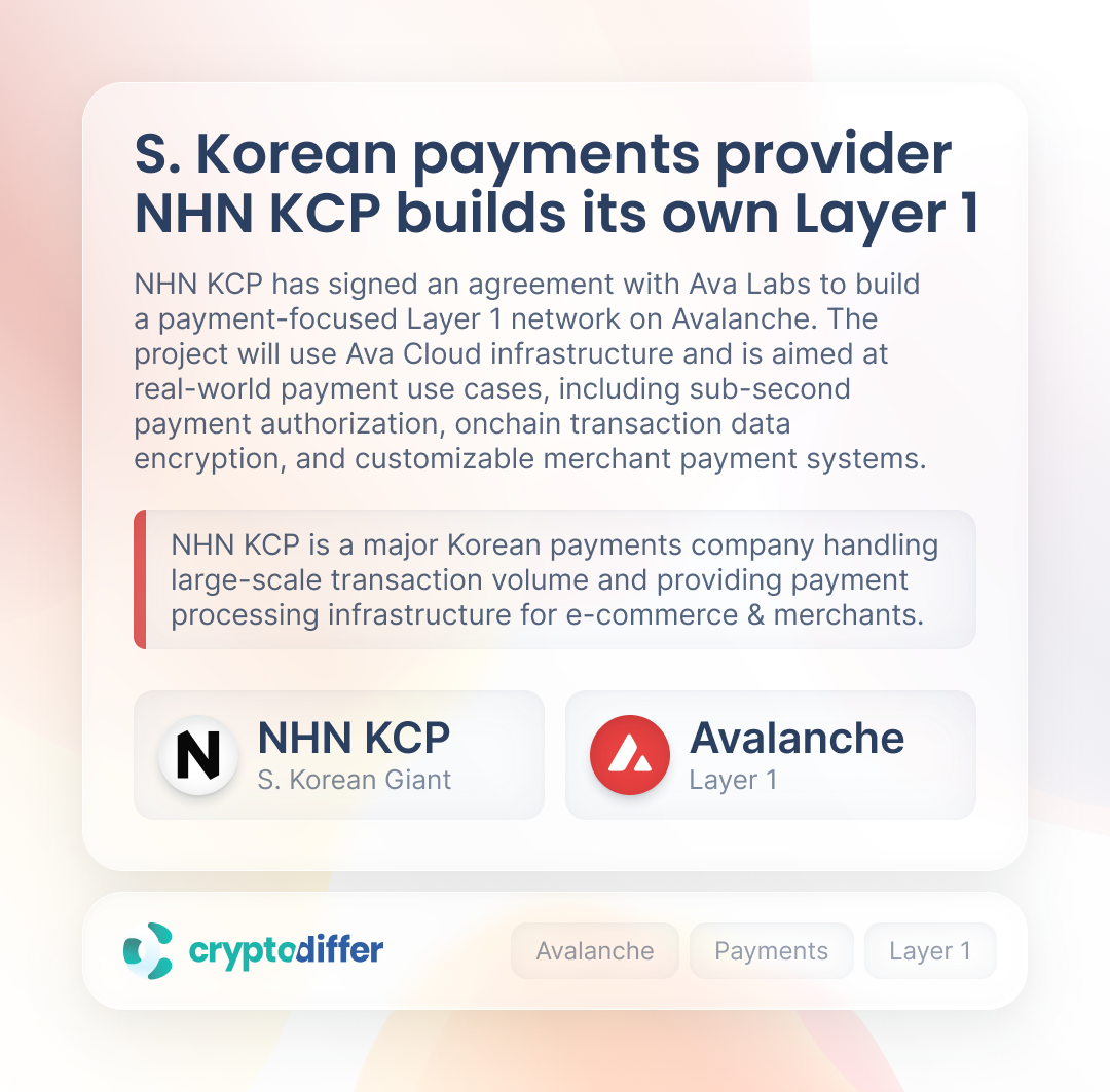 NHN KCP signed an agreement with Ava Labs to build a payment-focused Layer 1 network on Avalanche. The project will use Ava Cloud infrastructure and is aimed at real-world payment use cases,