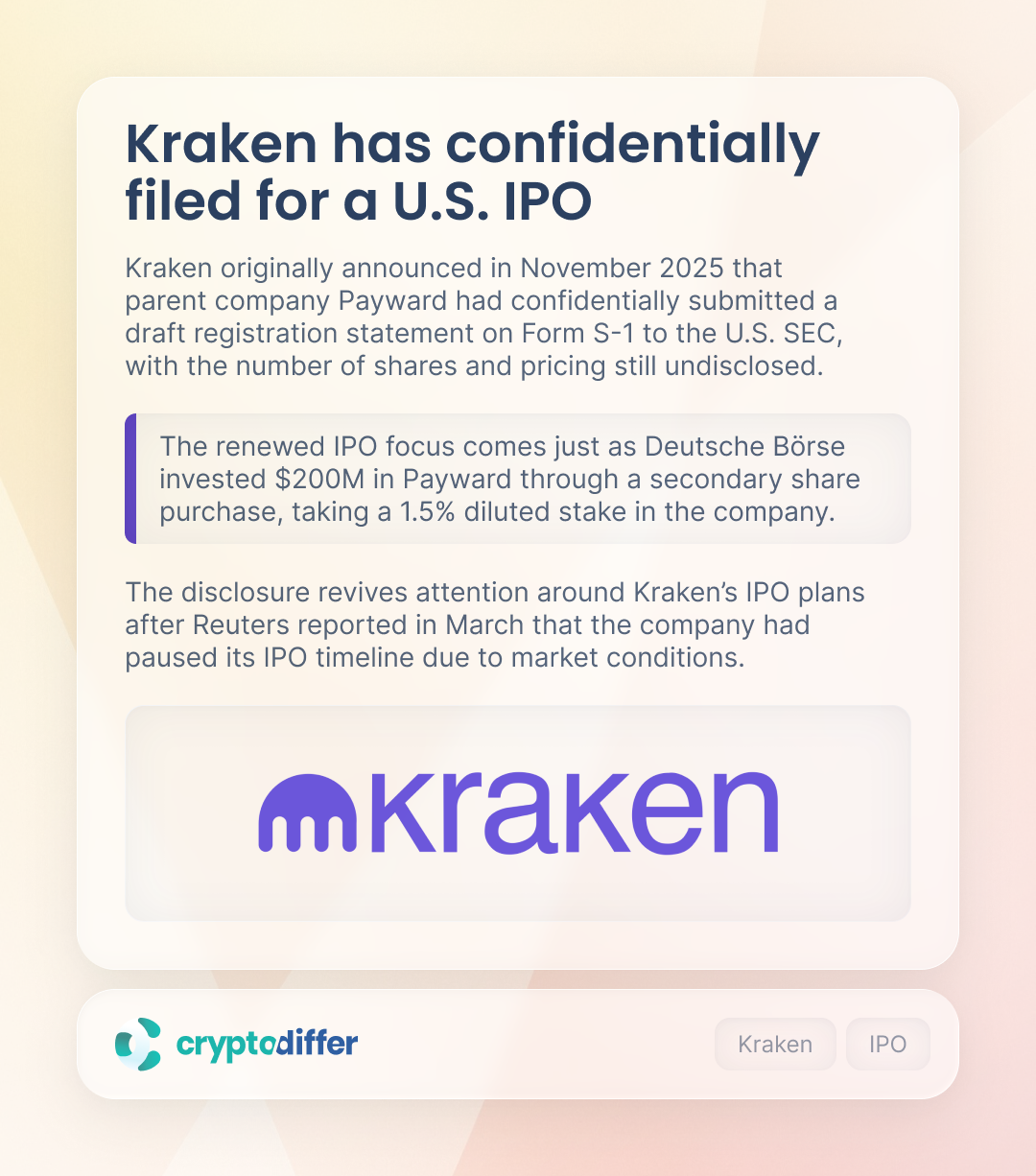 Kraken originally announced in November 2025 that parent company Payward had confidentially submitted a draft registration statement on Form S-1 to the U.S. SEC, with the number of shares and pricing still undisclosed.