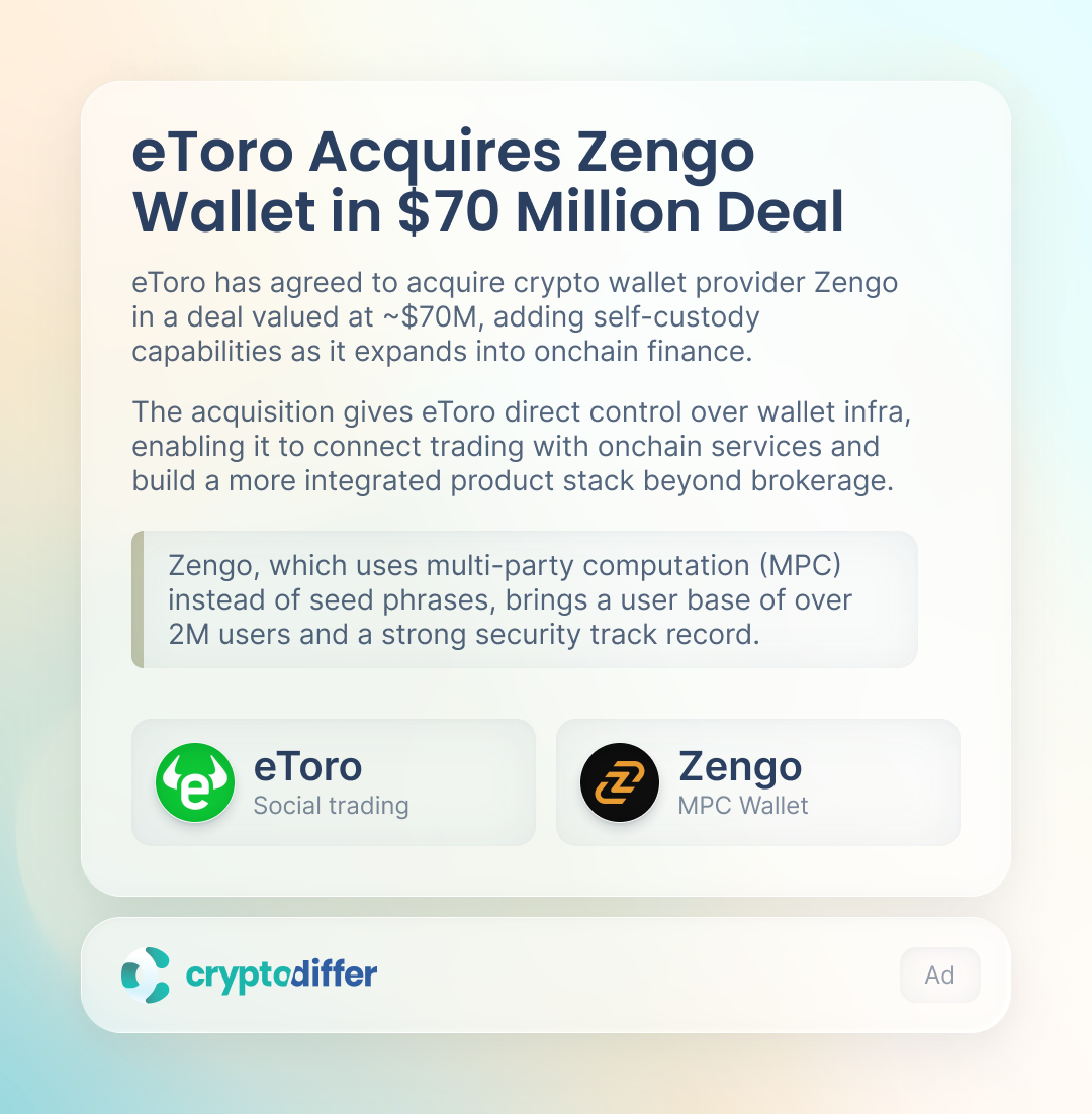 eToro has agreed to acquire crypto wallet provider Zengo in a deal valued at ~$70M, as it moves to add self-custody and expand its presence in onchain finance.