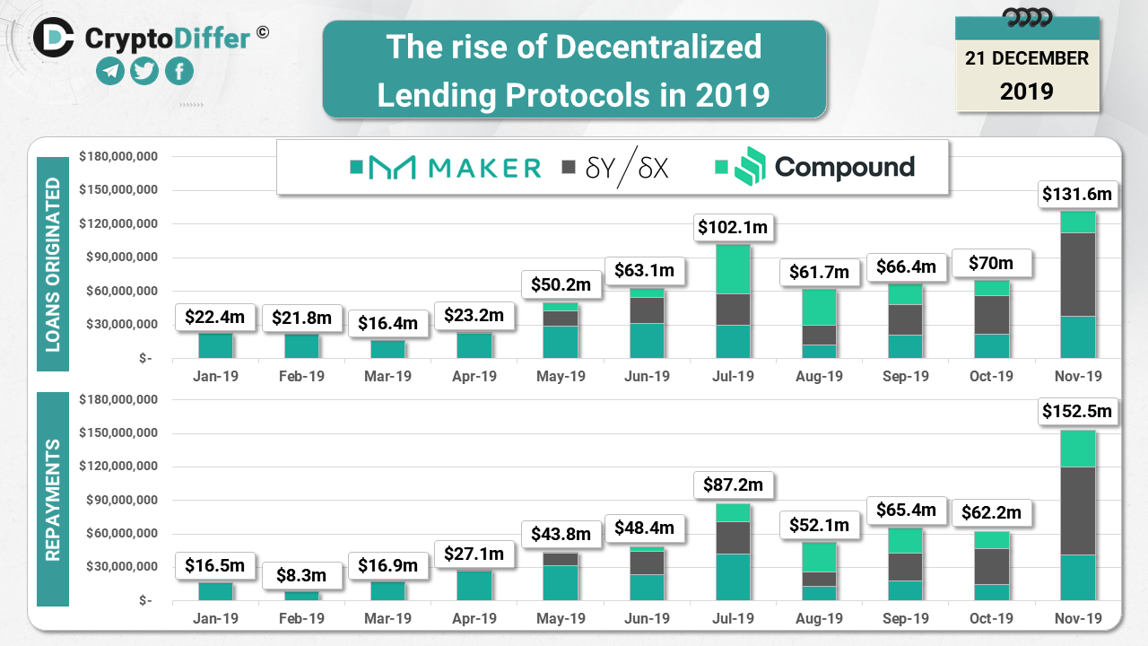 In November, over $131 million of loans were originated through open finance (decentralized finance) protocols such as MakerDAO, Compound, and dYdX, up more than 600% comparing to the December volume.
