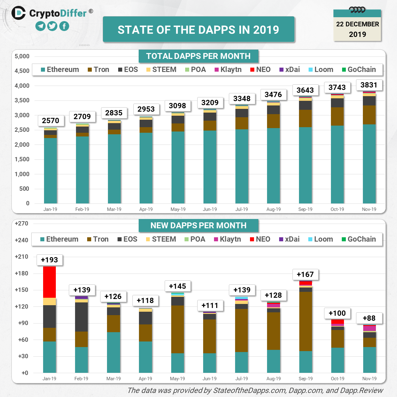 The infographic presents month to month number of total and new DApps on the major DApp platforms: Ethereum, EOS, Tron, Steem, Klaytn, NEO, POA, XDai, Loom, Gochain, OST.
