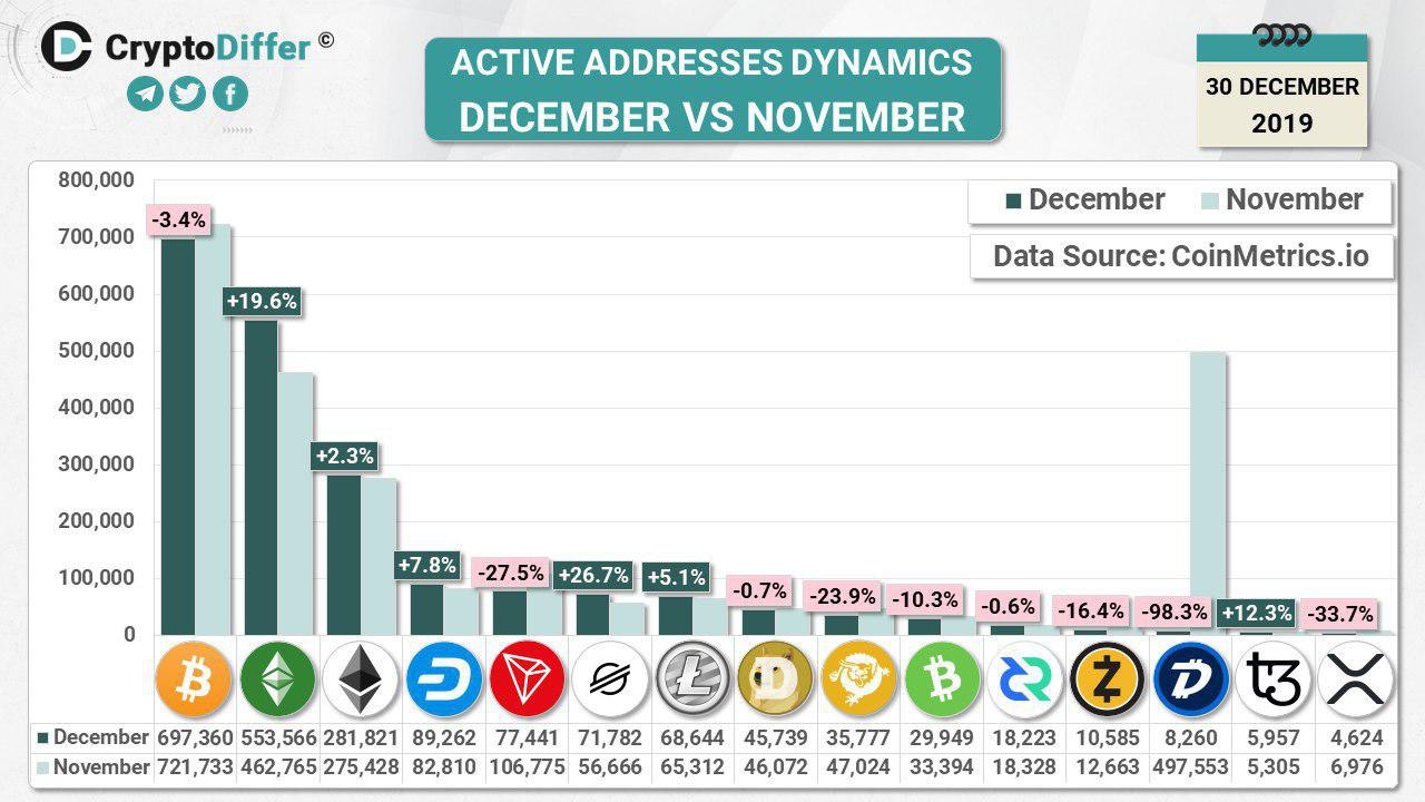 This month, Tezos has entered the list, Tezos took 14th spot with average of 5957 active addresses in December and outperformed Ripple and Cardano (Cardano took 16th position and are not represented on the infographic)