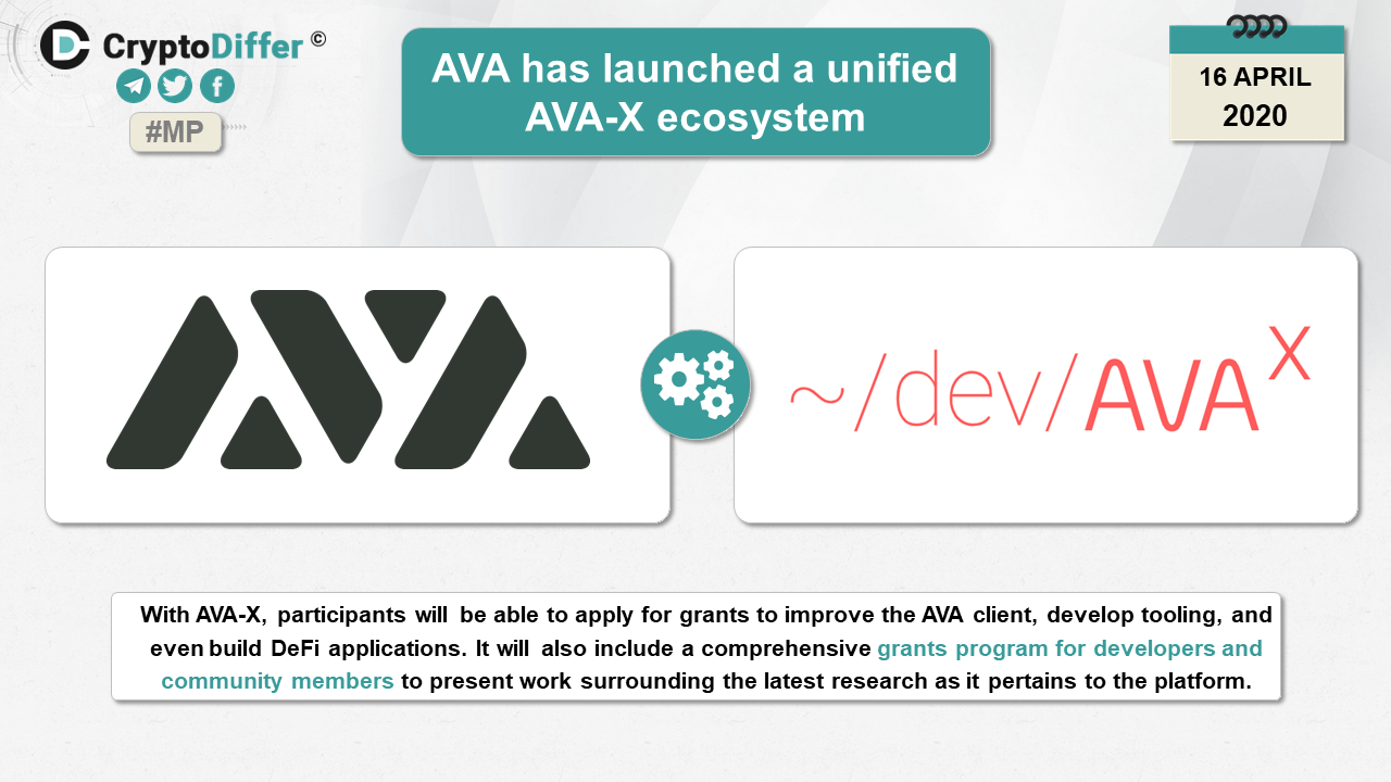 AVA-X is an ecosystem that will enable people to educate, research, and build decentralized ecosystems. With AVA-X, participants will be able to apply for grants to improve the AVA client, develop tooling, and even build DeFi applications such as lending apps, derivative contracts, and stablecoins.