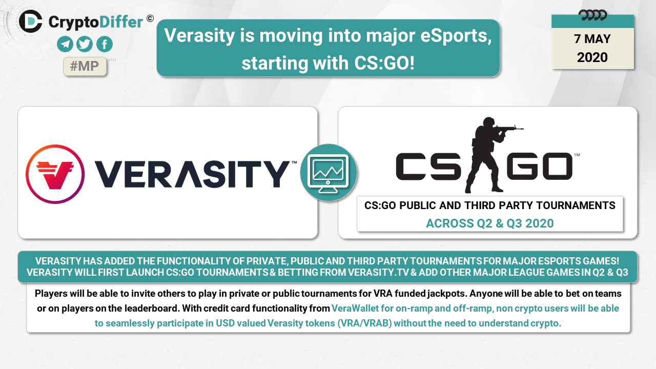 Verasity will first launch CS:GO tournaments and betting from VerasityTV and add other major league games in Q2&Q3 (League of Legends and others). Players will be able to invite others to play in private or public tournaments for VRA funded jackpots. With credit card functionality from VeraWallet for on-ramp and off-ramp, non crypto users will be able to seamlessly participate in USD valued Verasity tokens (VRA/VRAB) without the need to understand crypto.