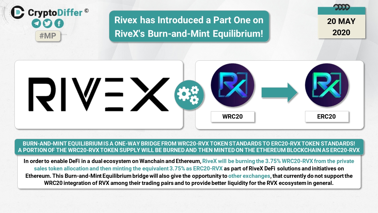 Burn-and-Mint Equilibrium is a one-way bridge from WRC20-RVX token standards to ERC20-RVX token standards. A portion of the WRC20-RVX token supply will be burned and then minted on the Ethereum blockchain as ERC20-RVX. In order to enable DeFi in a dual ecosystem on Wanchain and Ethereum, RiveX will be burning the 3.75% WRC20-RVX from the private sales token allocation and then minting the equivalent 3.75% as ERC20-RVX as part of RiveX DeFi solutions and initiatives on Ethereum.