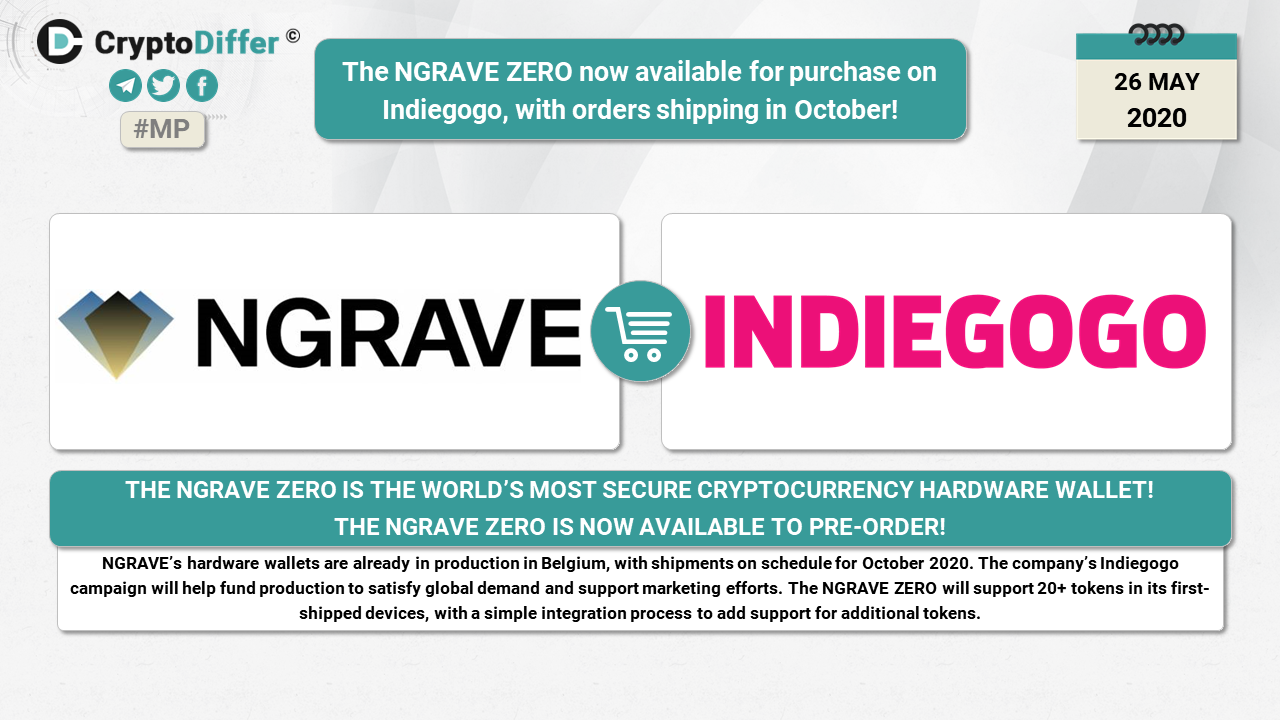 NGRAVEβs hardware wallets are already in production in Belgium, with shipments on schedule for October 2020. The companyβs Indiegogo campaign will help fund production to satisfy global demand and support marketing efforts. The NGRAVE ZERO will support 20+ tokens in its first-shipped devices, with a simple integration process to add support for additional tokens.