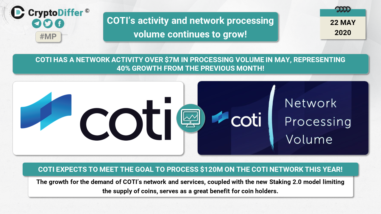 COTI has a network activity over $7M in processing volume in May, representing 40% growth from the previous month! COTI expects to meet the goal to process $120M on the COTI network this year! The growth for the demand of COTIβs network and services, coupled with the new Staking 2.0 model limiting the supply of coins, serves as a great benefit for coin holders.