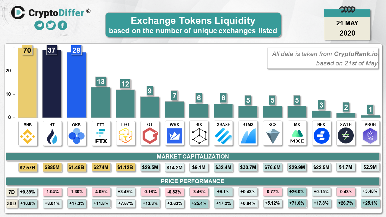 We prepared a comparison list of TOP-15 Exchange tokens based on the number of unique exchanges on which these tokens are listed. The tokens of the biggest exchanges such as BNB, HT, OKB, LEO remain at the top of the list.