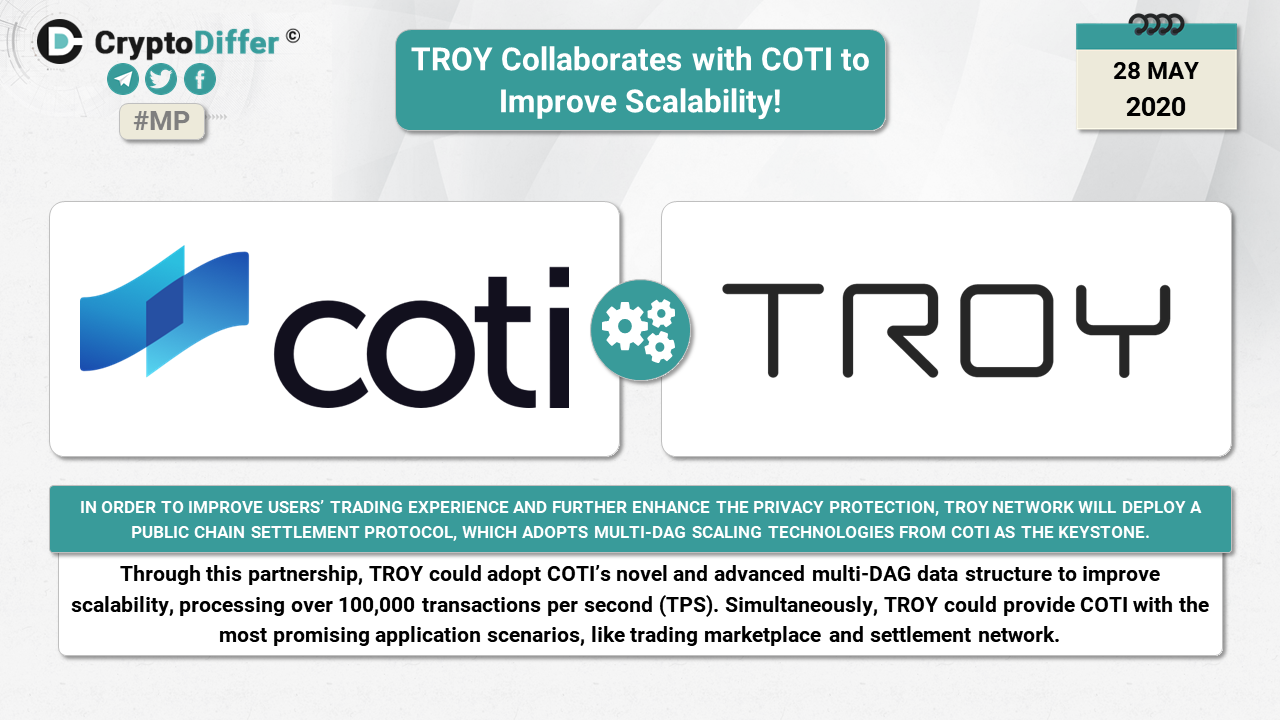 Through this partnership, TROY could adopt COTIβs novel and advanced multi-DAG data structure to improve scalability, processing over 100,000 transactions per second (TPS). Simultaneously, TROY could provide COTI with the most promising application scenarios, like trading marketplace and settlement network.