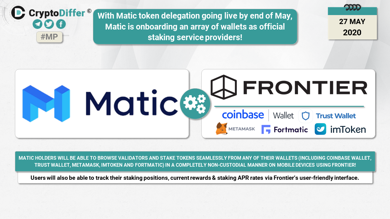 MATIC holders will be able to browse validators and stake tokens seamlessly from any of their wallets (including Coinbase Wallet, Trust Wallet, Metamask, imToken and Fortmatic) in a completely non-custodial manner on mobile devices using Frontier.