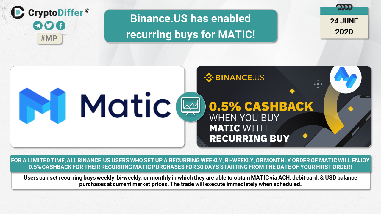 To celebrate, Binance US is offering 0.5% cash back when people purchase MATIC using their recurring buy feature, running until July 8th at 1:00 PM UTC.