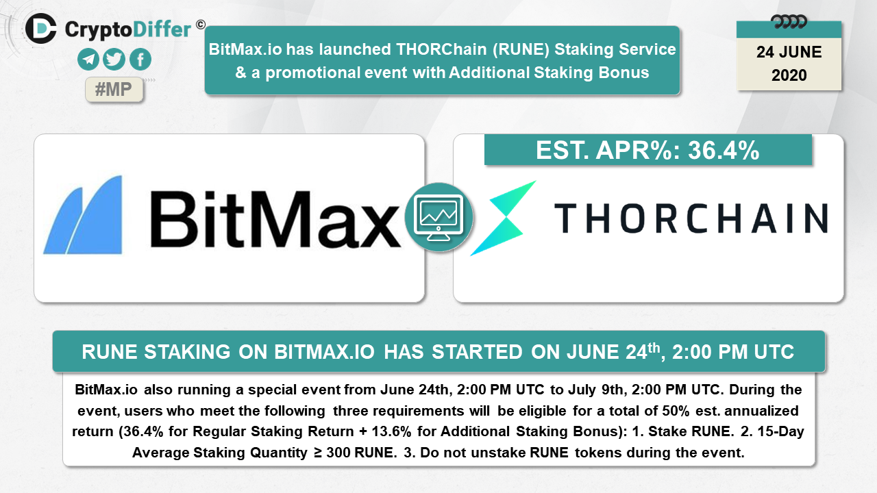 RUNE staking on BitMax.io has started on June 24th, 2:00 PM UTC with Estimated Annualized Return of 36.4%.